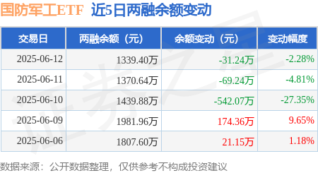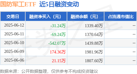 本站消息,6月12日,国防军工ETF(512810)融资买入154.37万元,融资偿还185.6万元,融资净卖出31.24万元,融资余额1339.4万元。